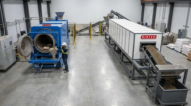 По своей сути, разница между ротационными печами периодического и непрерывного действия заключается в философии обращения с материалами. Печь периодического действия обрабатывает материал отдельными, дискретными партиями, выполняя полный цикл загрузки, нагрева и выгрузки для каждой из них. Напротив, печь непрерывного действия работает как бесперебойная система, в которую постоянно подается сырье с одного конца, а готовый продукт стабильно выгружается с другого.
